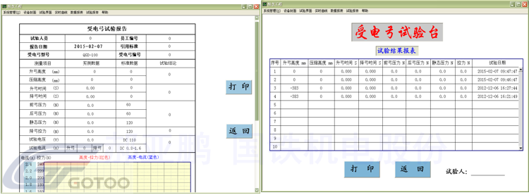 Can be used for automatic test of the static pressure characteristic curve of a subway vehicle's pantograph. It measures the static contact pressure, bowing time, and the maximum height of the bow. It has the function of measuring the height and pressure of the lifting bow and forming a curve graph function, and it is suitable for the minimum movement air. Pressure, start-up force, rapid drop of the bow function, air pipeline leak pressure maintenance state testing test. The equipment provides a variety of test conditions that meet the pantograph process range, with computer automatic control and information management functions.