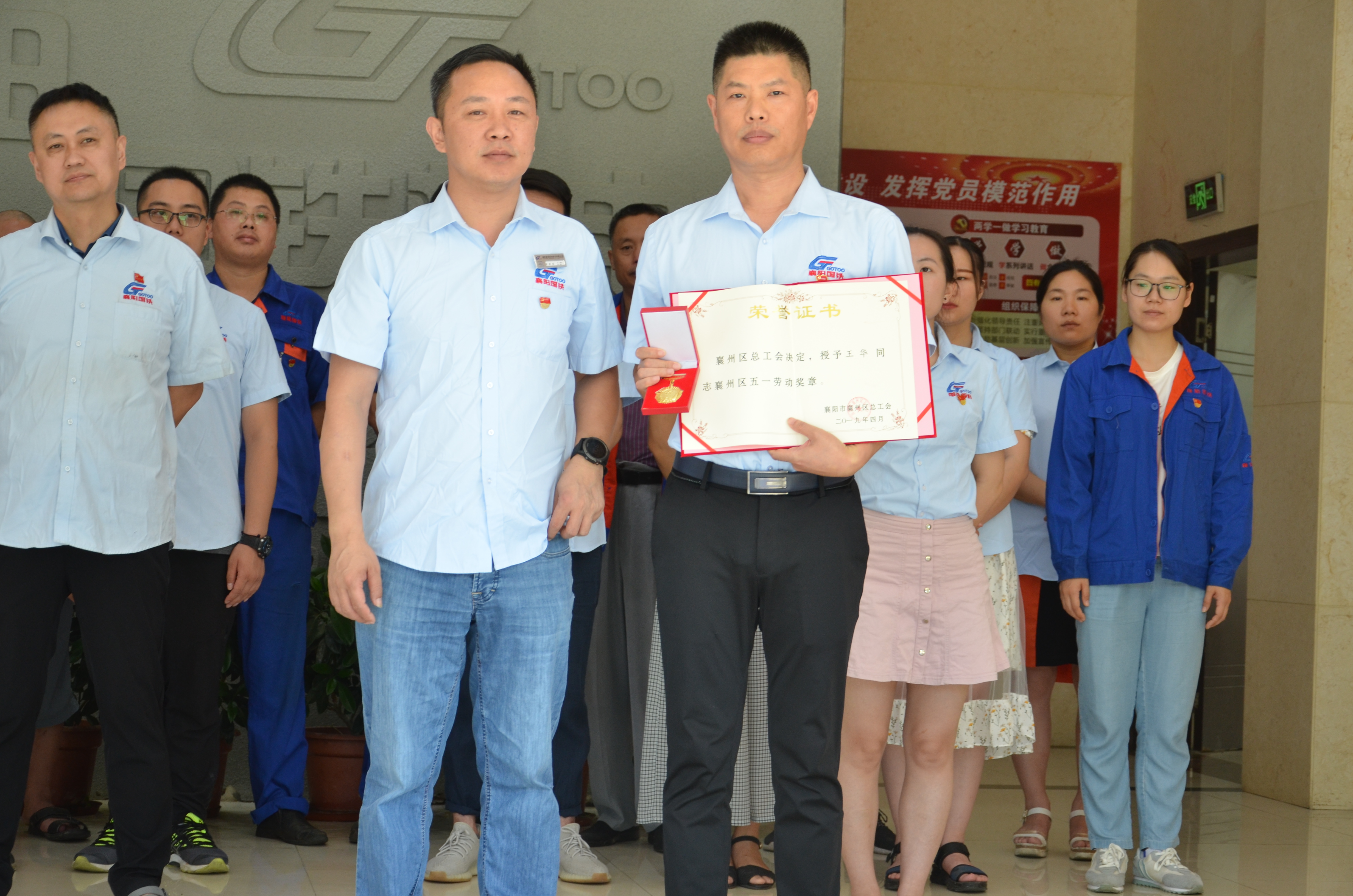 襄州區(qū)總工會(huì)決定,授予“王華同志襄州區(qū)五一勞動(dòng)獎(jiǎng)?wù)隆保皇谟琛跋尻枃F機(jī)電股份有限公司研發(fā)中心襄陽工人先鋒號(hào)”獎(jiǎng)?wù)?。由黨支部書記代表代表襄州區(qū)總工會(huì)授予獲獎(jiǎng)部門獎(jiǎng)?wù)隆⒆C書、獎(jiǎng)牌。